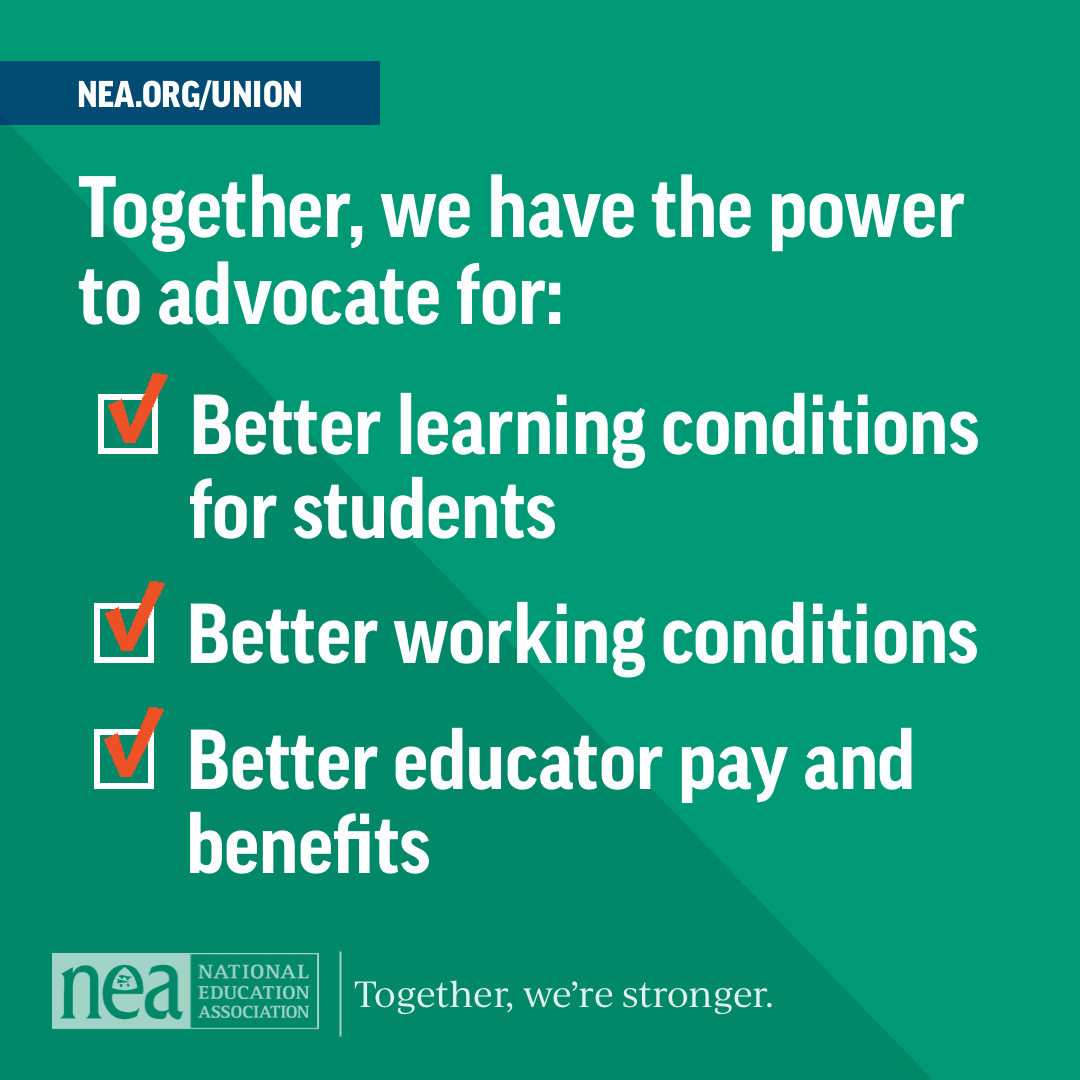 When educators are respected, appreciated, heard, and have the resources we need, we can give students our very best. NEA members come together through our union to win for our students, our schools, and ourselves.
